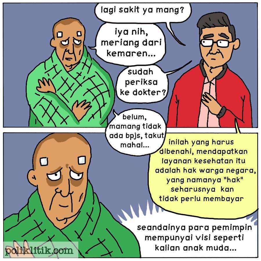 Kalo kita baca UUD Pasal 28 H sama Pasal 34, intinya adalah “Setiap warga negara berhak mendapatkan layanan kesehatan”